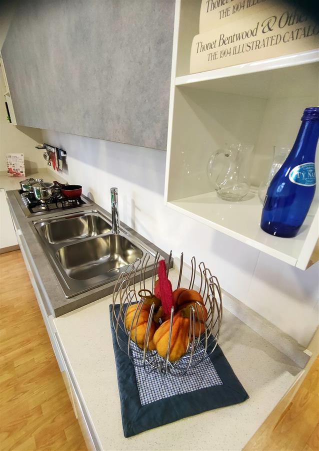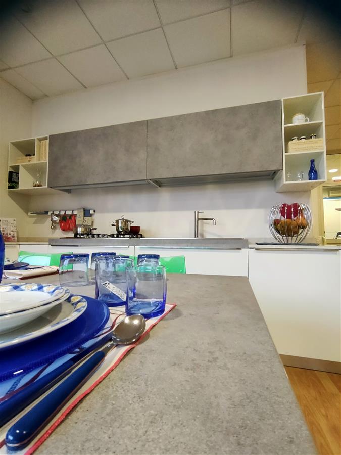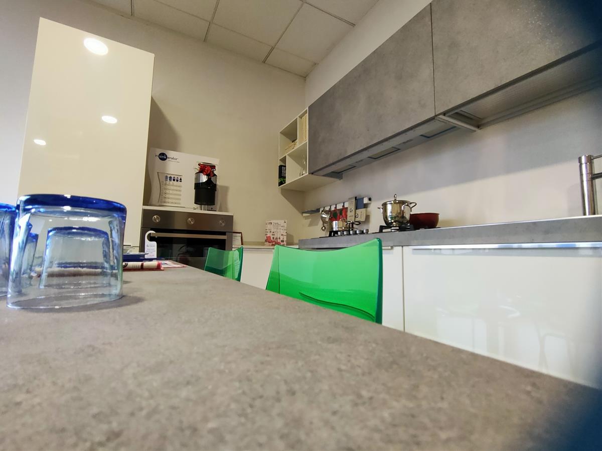 CUCINA BIANCO LUCIDO E FINITURA PORFIDO GRIGIO CON TOP IN QUARZO E LAMINATO PROFIDO GRIGIO
